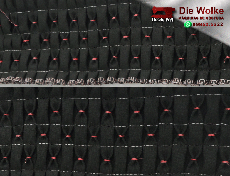 Botoneira industrial adaptada para fazer o pontinho do favo: com apenas um toque no pedal executa a costura do favo (pontinho), a partir das pregas previamente feitas na máquina da Etapa 1. Não funciona com pregas feitas a mão, apenas com as feitas a partir da máquina de pregas da etapa 1.